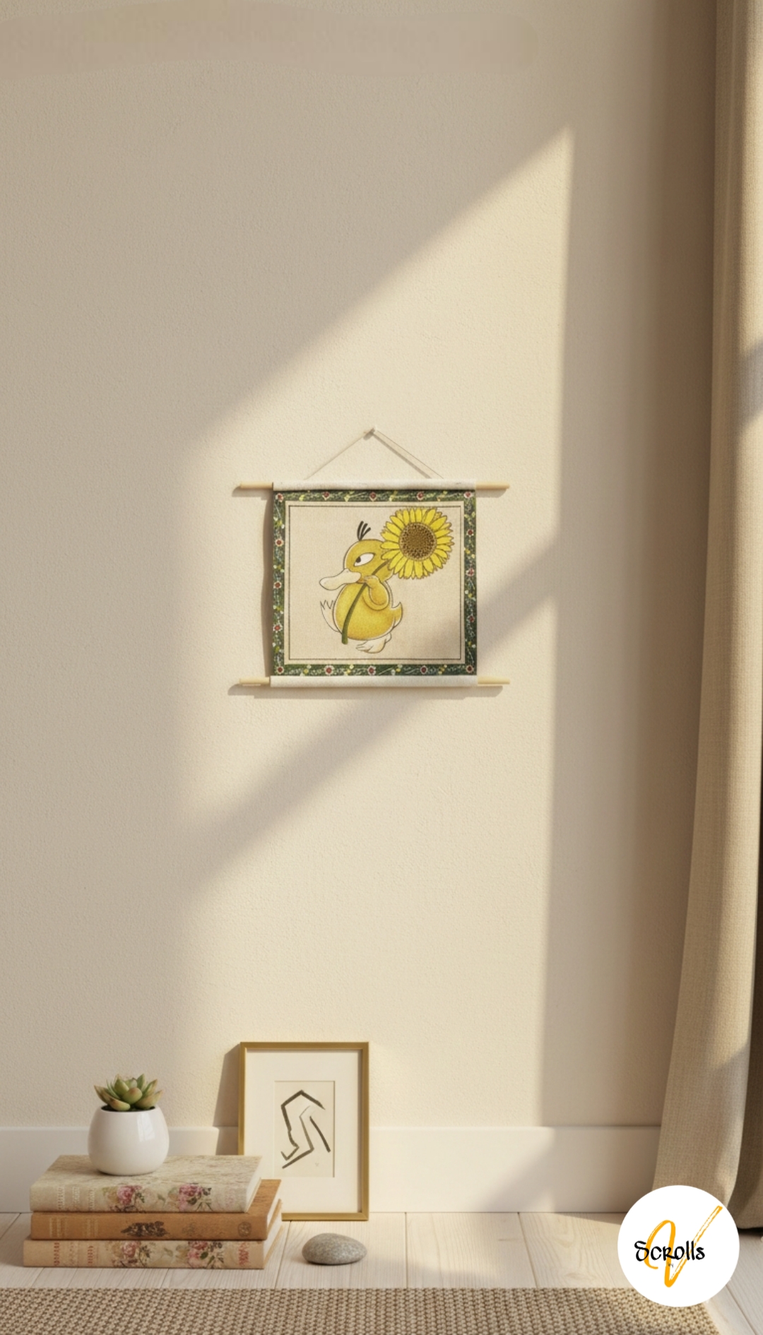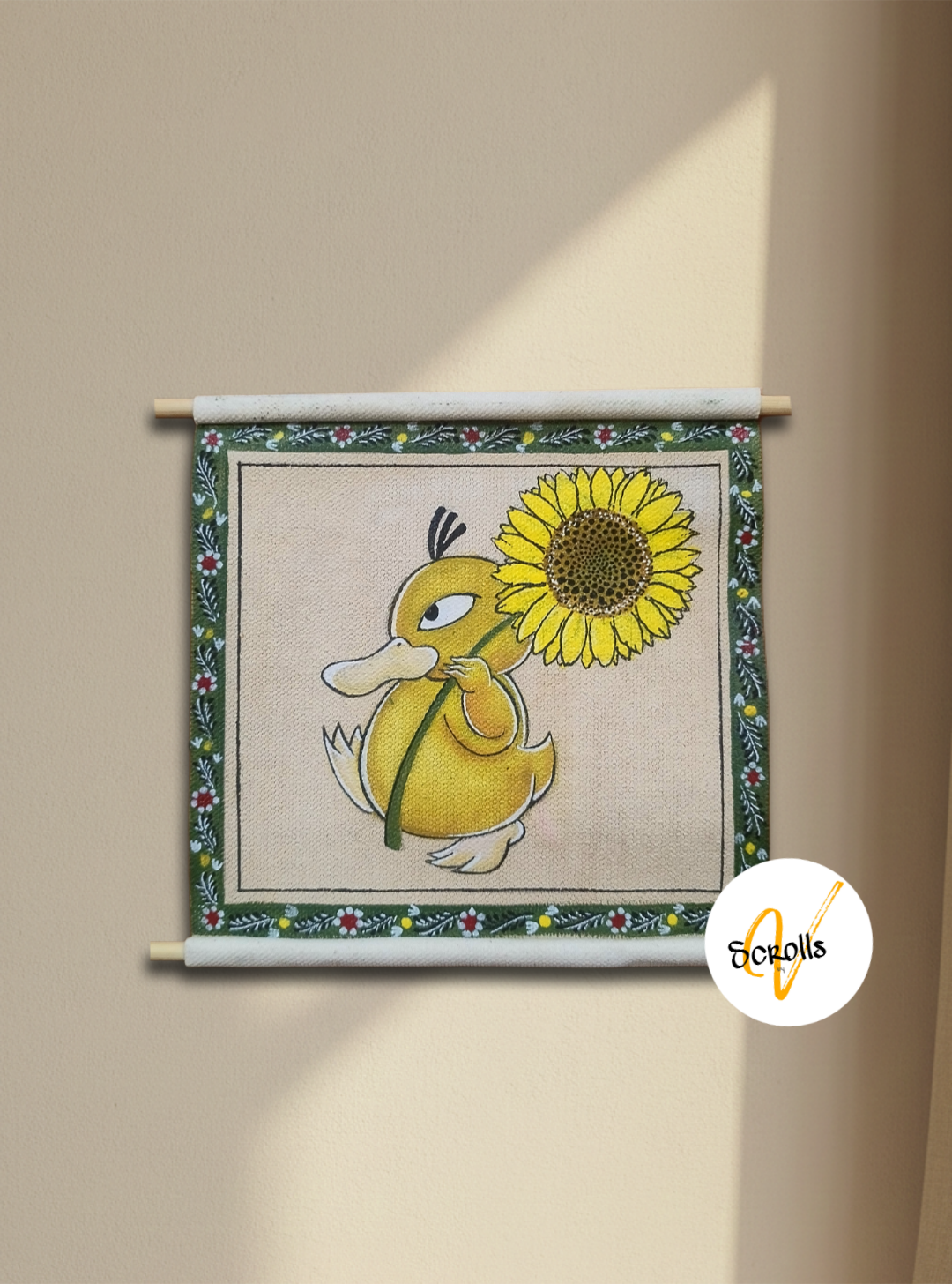 Hand painted inspired scroll depicting modern theme of a duck holding sunflower in Pattachitra painting style. Size- 14cms x 15cms. Medium- Acrylic on canvas with 5mm thick wooden scroll rods.