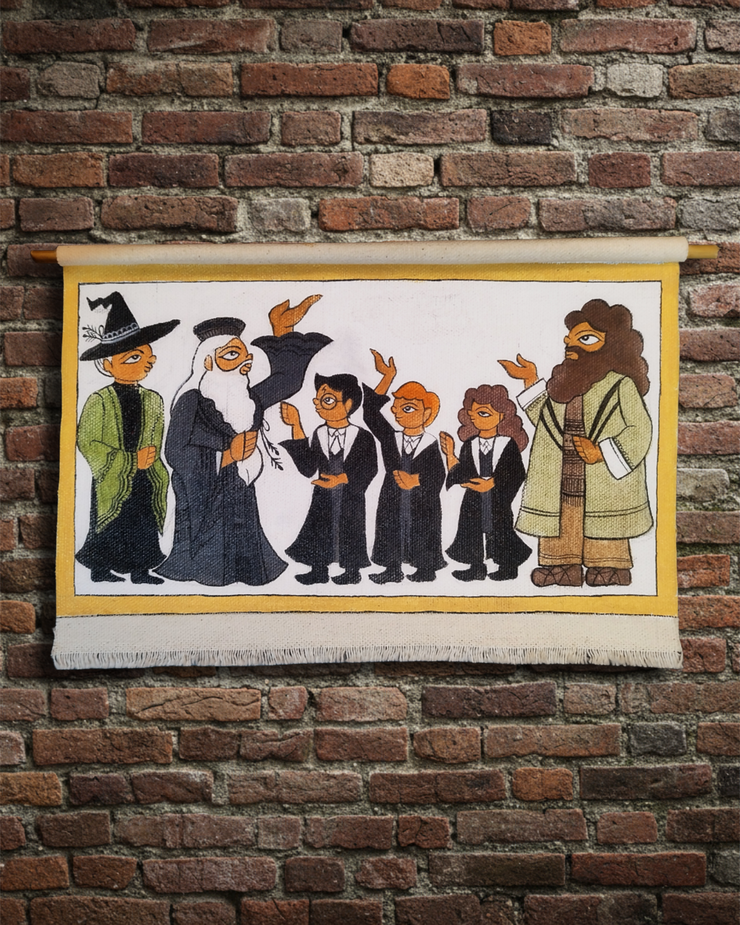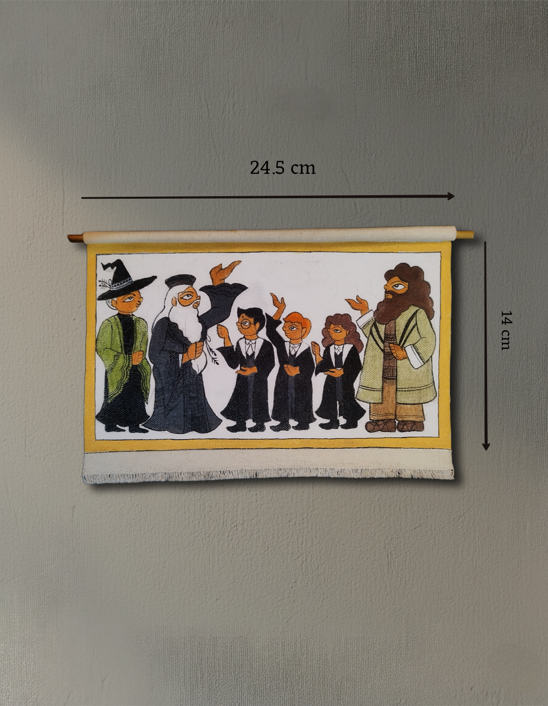 Hand painted Wizards and witches in Phad inspired painting style. Size- 24.5cms x 14cms.  Acrylic on canvas with 2.5 mm wooden rod made into a scroll.